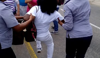 Tras sonreír de forma cínica mientras era conducida amablemente por la policía, (ver video) la líder de las llamadas Damas de Blanco, Berta Soler, aprovechó la ocasión para patear a una de las vecinas de la localidad.
